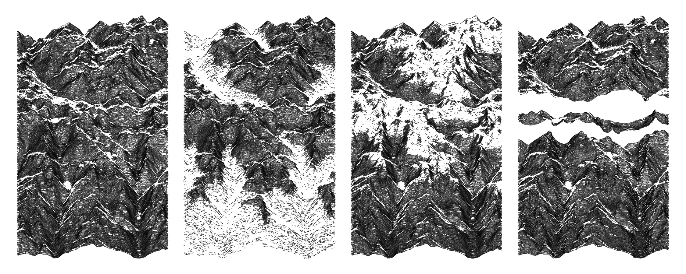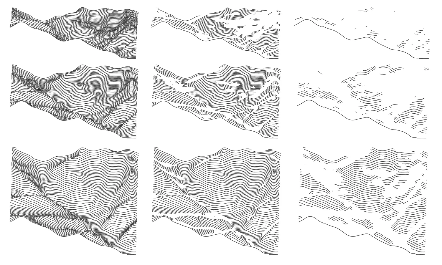 Finally, the overall aesthetic is obtained by adding noise and discarding data as a function of various attributes (elevation, slope, elevation dispersion). The governing idea was to test how our perception of the landscape changes when most of the initial topographical data is perturbed or removed. Here are four methods, but much is left to explore. The illustration code here is functioning without external call, but highly redundant and surely not optimal, you can conveniently hide it if you feel horrified.