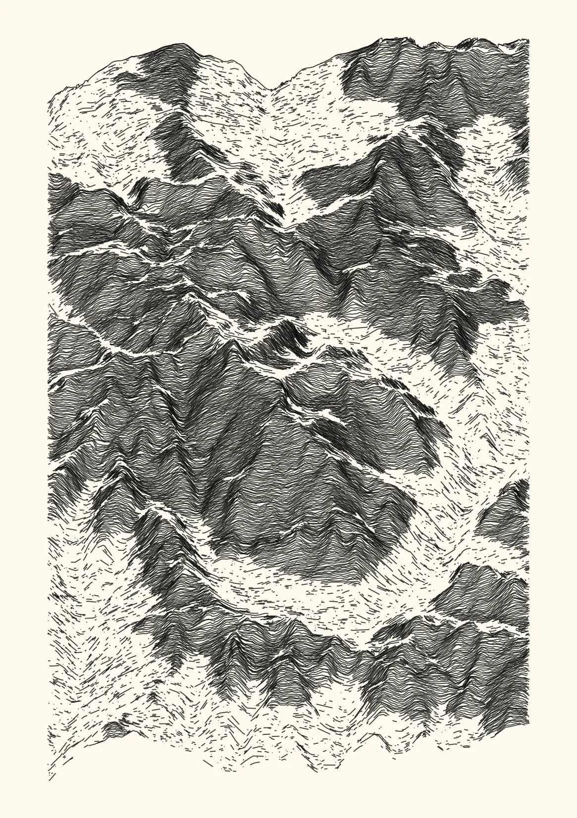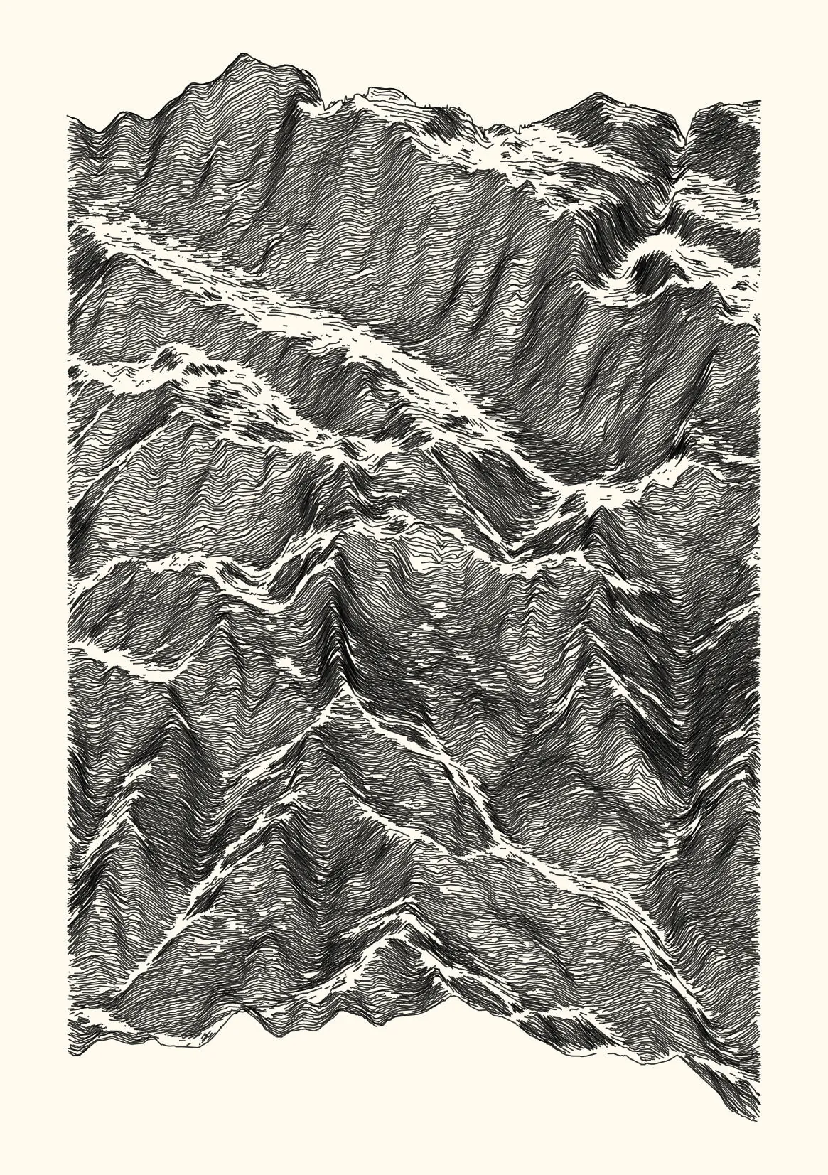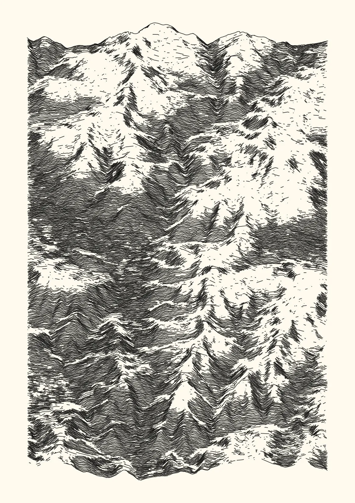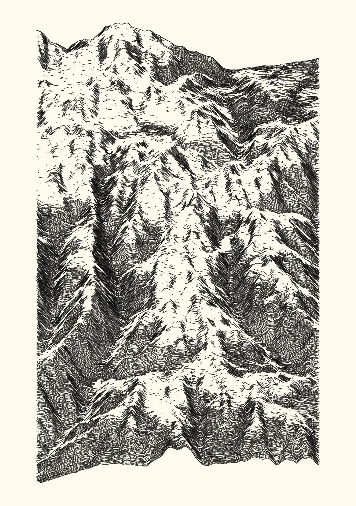 get_features_ridge(seed = 15) |> gen_dispyr(n_ridges = 800) |> plot_ridge()Process topographical data into monochromatic ink sketches.