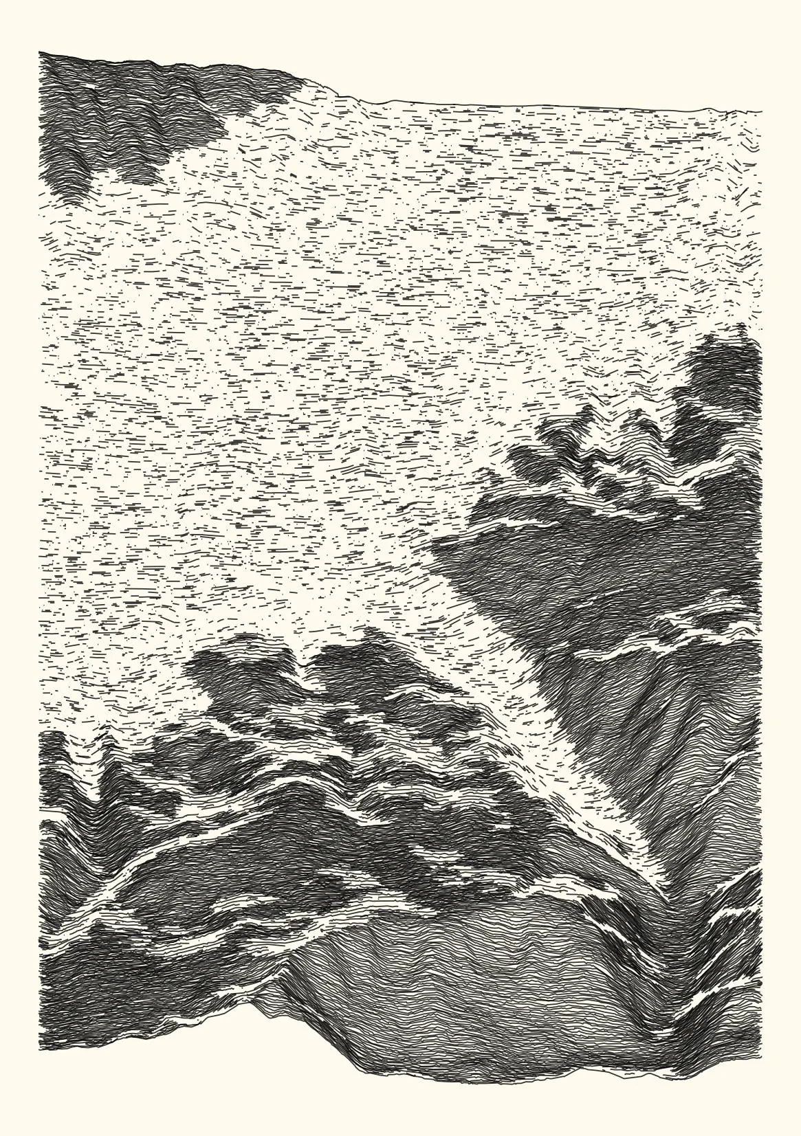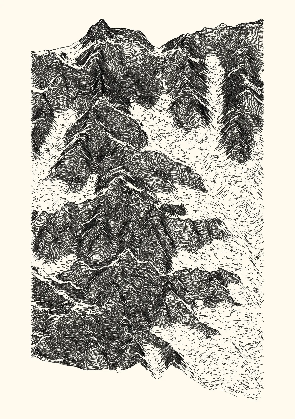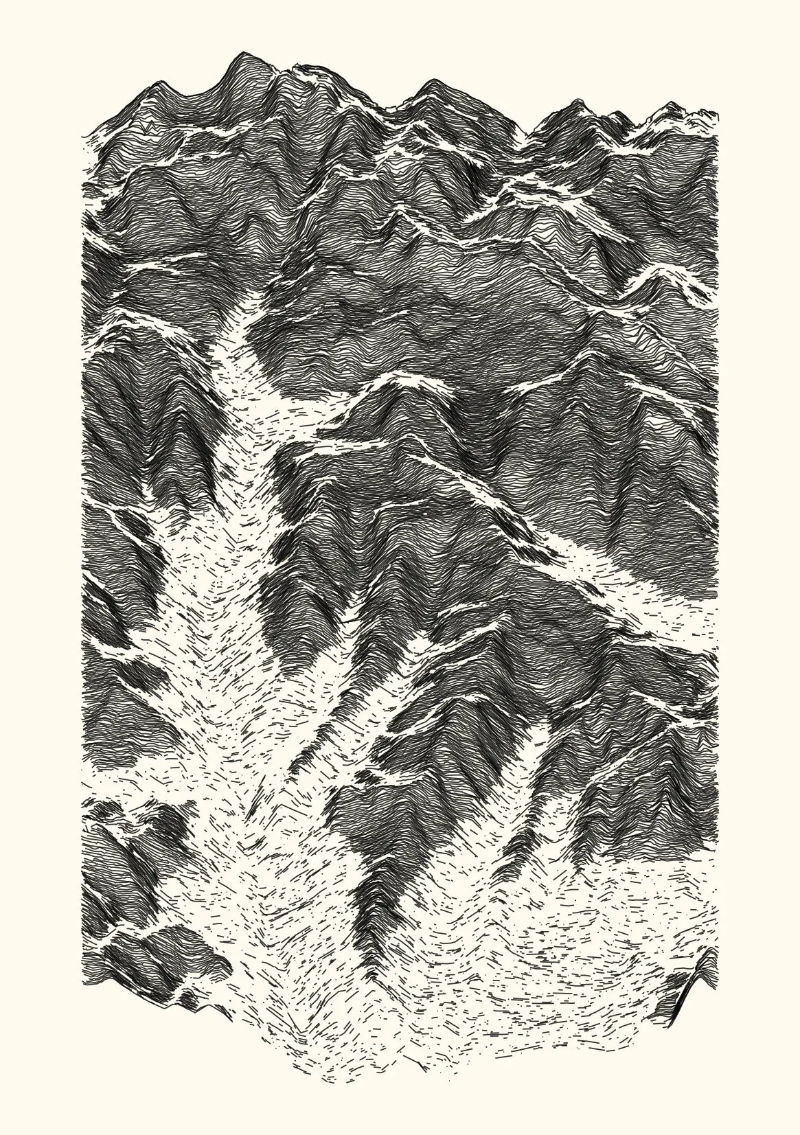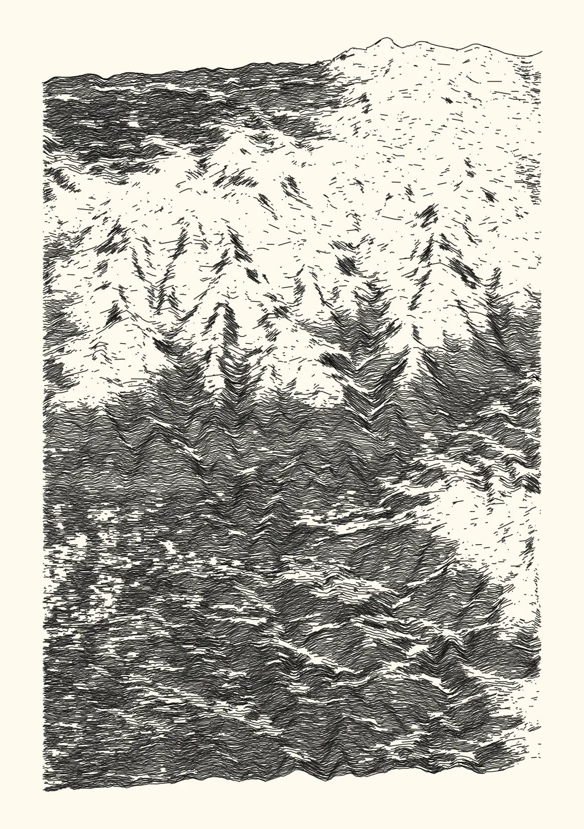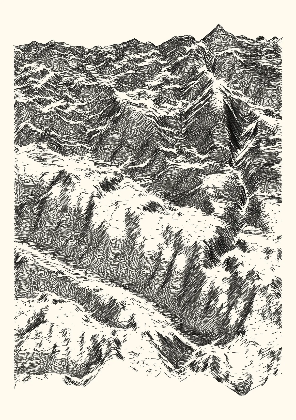 get_features_ridge(seed = 15) |> gen_dispyr(n_ridges = 800) |> plot_ridge()Process topographical data into monochromatic ink sketches.