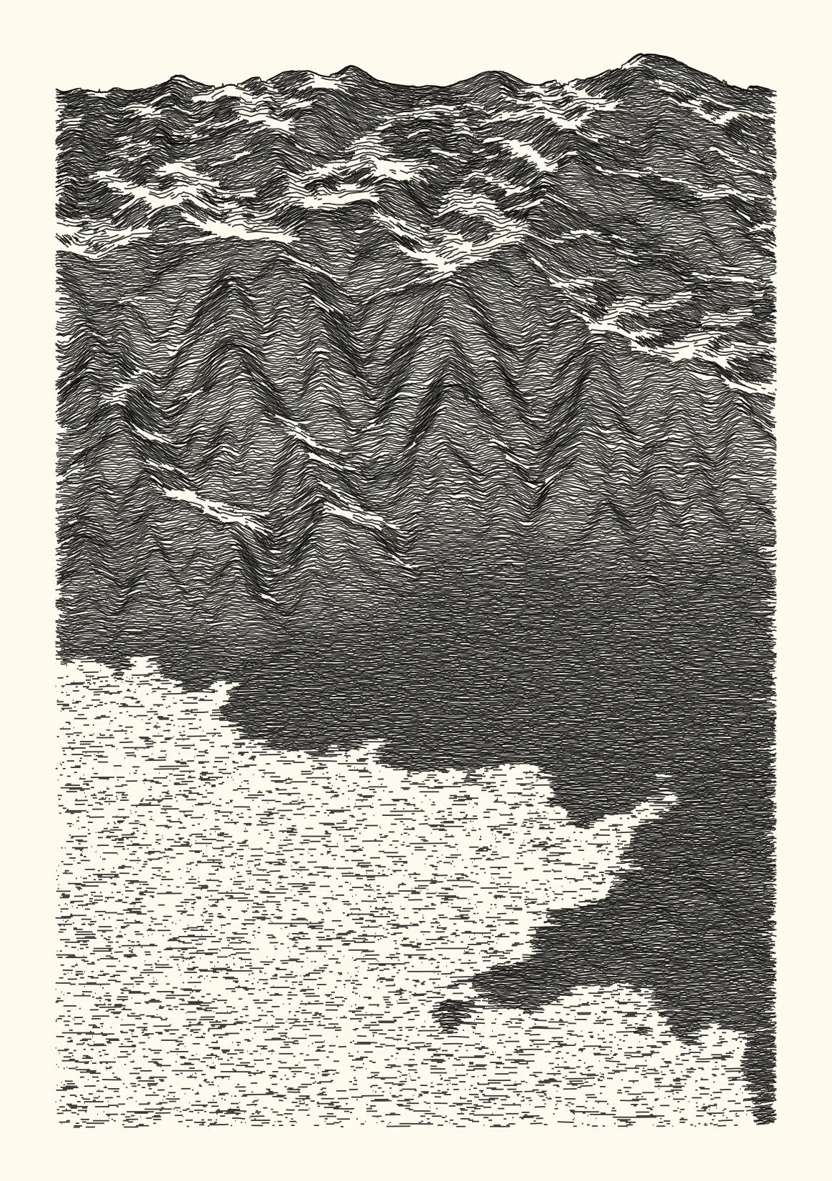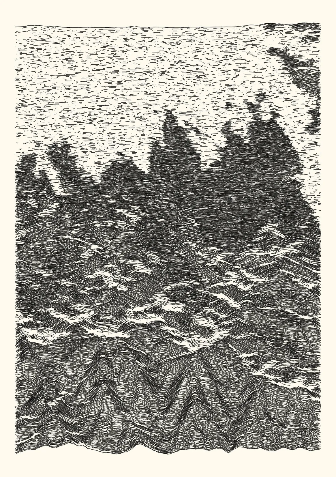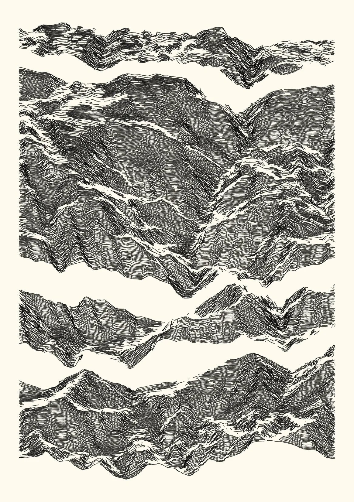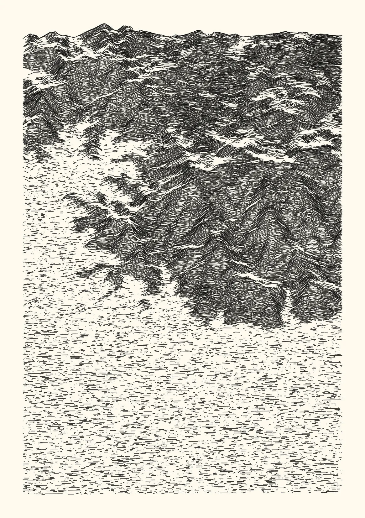 get_features_ridge(seed = 15) |> gen_dispyr(n_ridges = 800) |> plot_ridge()Process topographical data into monochromatic ink sketches.