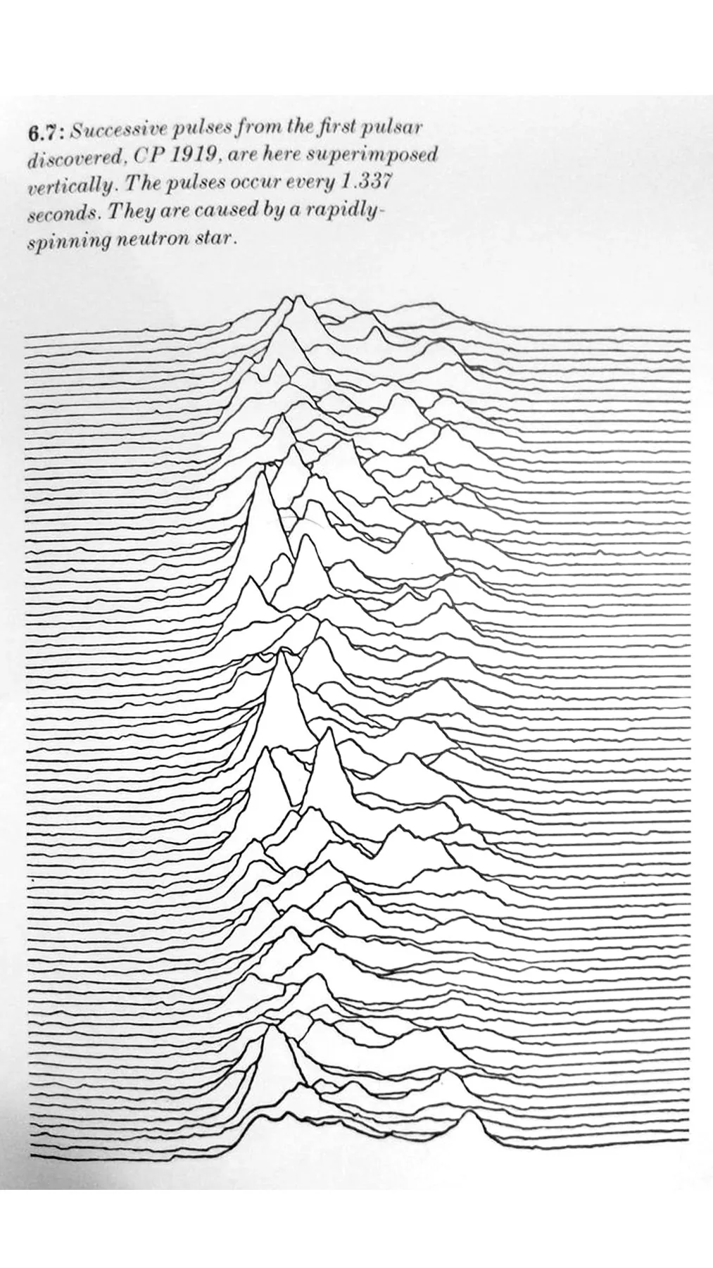 left : “Successive pulses from the first pulsar discovered, CP 1919, are here superimposed vertically. The pulses occur every 1.337 seconds. They are caused by rapidly spinning neutron star.” From The Cambridge Encyclopaedia of Astronomy.